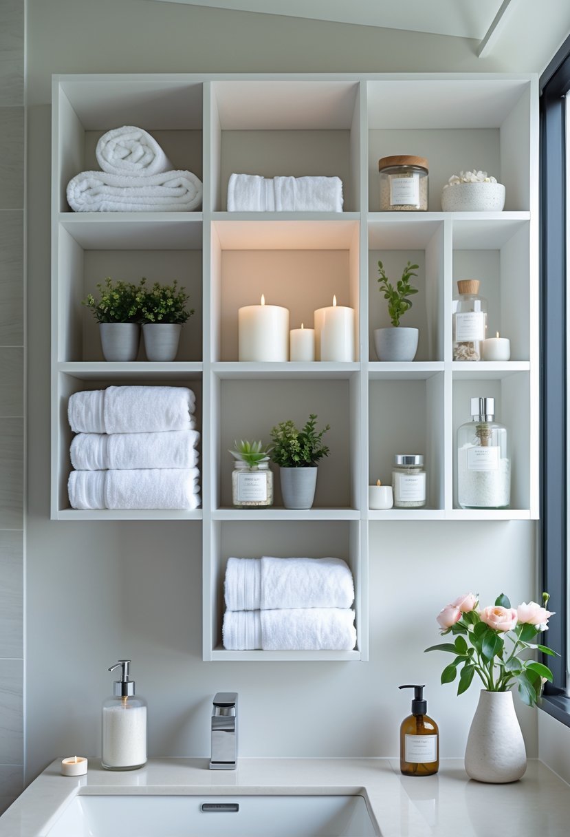 I find open cube shelving units both practical and stylish for bathroom storage. They offer multiple compartments, which makes organizing toiletries, towels, and decor simple and accessible.