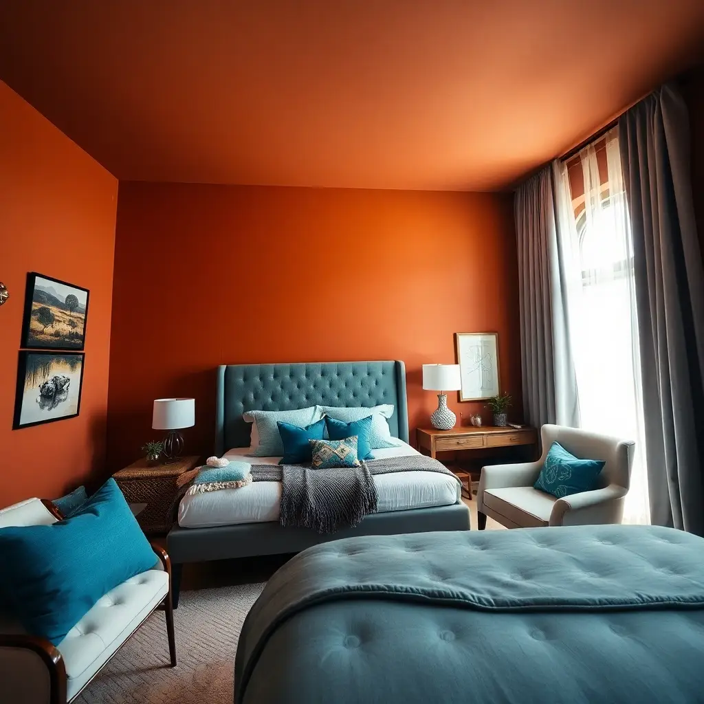 Terracotta and teal combines earthy warmth with sophisticated color depth. This rich combination creates bedrooms that feel both grounding and elegant. Rich terracotta walls provide warm, earthy sophistication. This color creates cozy, inviting spaces perfect for relaxation and comfort.